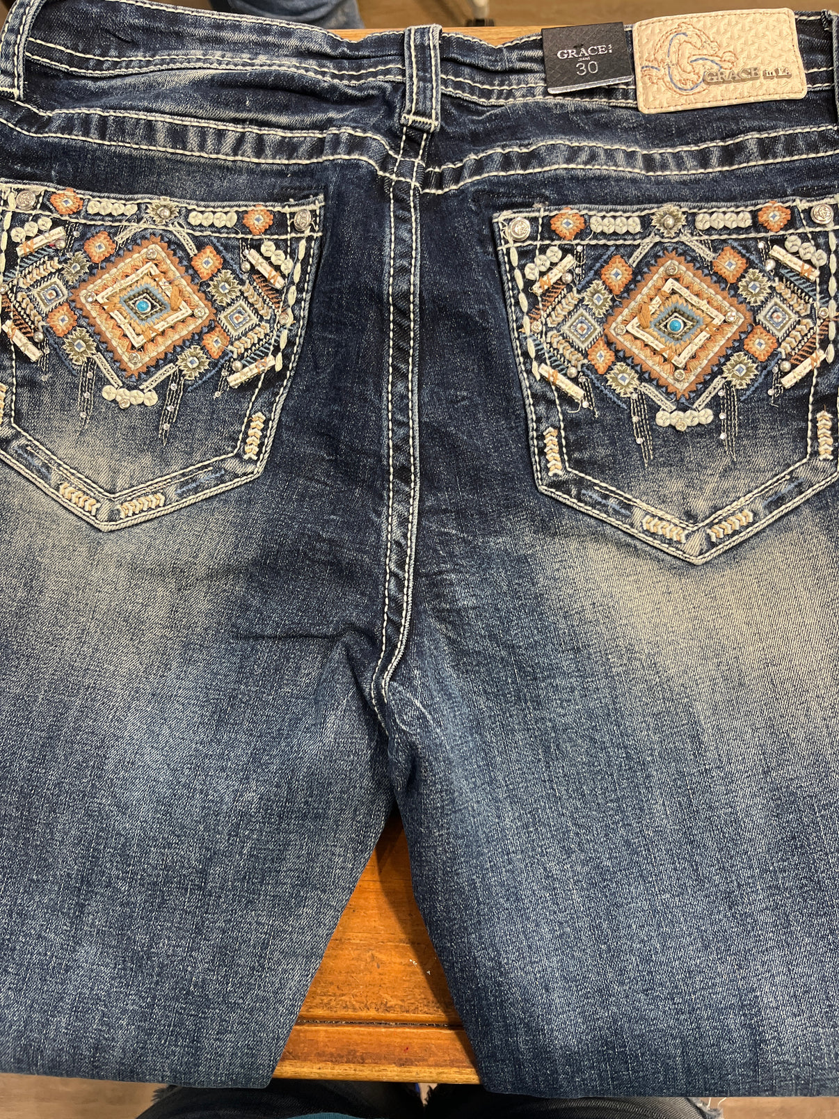 The Grace in LA women's denim short in Easy Fit shows off your best shape by featuring a higher rise. The denim fabric features a softer and higher stretch for exceptional comfort all while maintaining a denim look. The short is detailed with a horse shoe/star work medium wash, distressing, natural hand-sanding, and whiskering. The denim fabric has the perfect amount of stretch and great holding power.