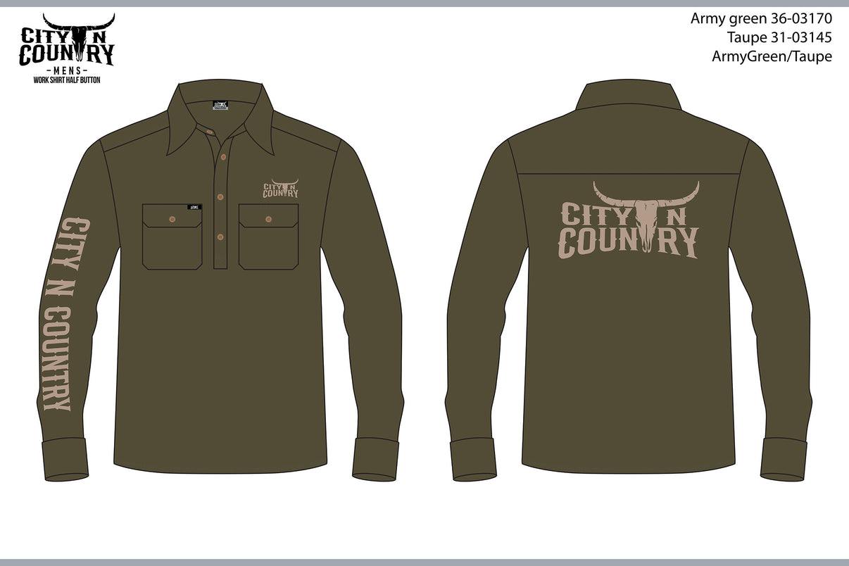 • City N Country Mens Embroidered Army Green and Taupe Work Shirt