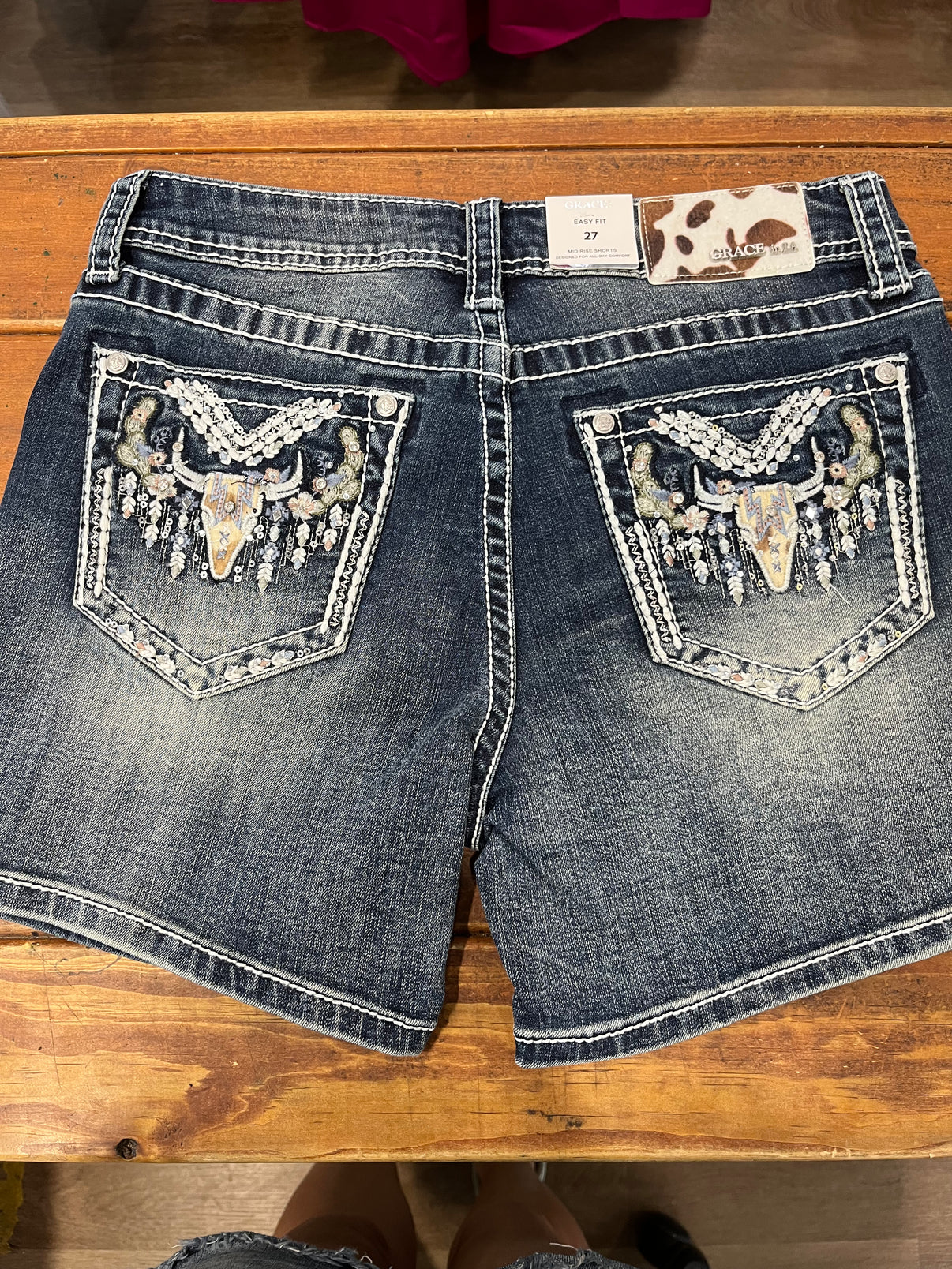 The Grace in LA women's denim short in Easy Fit shows off your best shape by featuring a higher rise. The denim fabric features a softer and higher stretch for exceptional comfort all while maintaining a denim look. The short is detailed with a horse shoe/star work medium wash, distressing, natural hand-sanding, and whiskering. The denim fabric has the perfect amount of stretch and great holding power.
