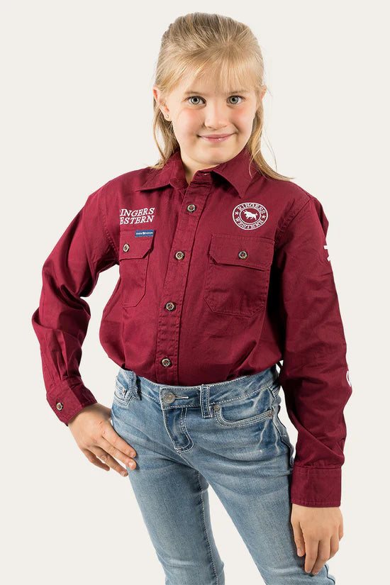 Ringers Western Kids Jackaroo Long Sleeve Full Button Embroidered Burgundy and White Work Shirt